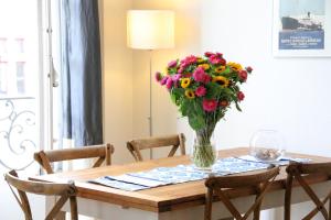 The accommodation features two bedrooms with four beds in total, complemented by a seating area and one bathroom equipped with a walk-in shower and hairdryer. A fully equipped kitchen includes an oven, stovetop, refrigerator, dishwasher, microwave, coffee machine as well as tea and coffee making facilities. Additional room amenities include bed linen, towels, heating, wardrobe or closet space, ironing facilities with iron and board, washing machine, sofa bed with both synthetic non-feather pillows and feather pillows for comfort.