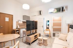 The accommodation comprises a living room with seating area and sofa, plus one separate bedroom. Guests will find a fully equipped kitchenette featuring a stovetop, microwave, refrigerator, toaster, coffee machine and electric kettle alongside kitchenware and tea and coffee making facilities. The bathroom includes a walk-in shower without steps, complimentary toiletries such as shampoo and body soap, hairdryer, bathtub or shower options including an in-room hot tub spa bath as well as bathrobes.